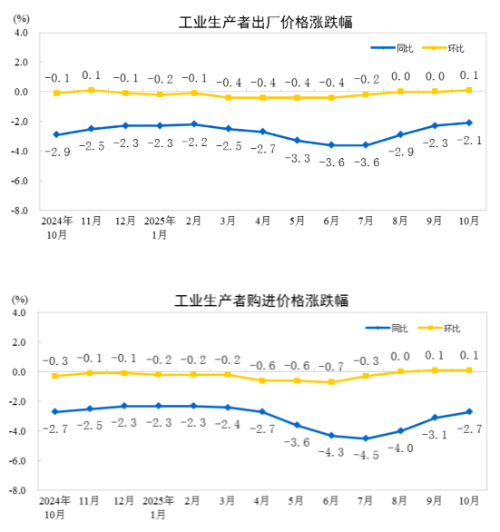 2025年10月份,全國工業(yè)生產(chǎn)者出廠價格同比下降2.1%,降幅比上月收窄0.2個百分點;環(huán)比由上月持平轉(zhuǎn)為上漲0.1%。工業(yè)生產(chǎn)者購進(jìn)價格同比下降2.7%,降幅比上月收窄0.4個百分點;環(huán)比上漲0.1%,漲幅與上月相同。1—10月平均,工業(yè)生產(chǎn)者出廠價格比上年同期下降2.7%,工業(yè)生產(chǎn)者購進(jìn)價格下降3.2%。